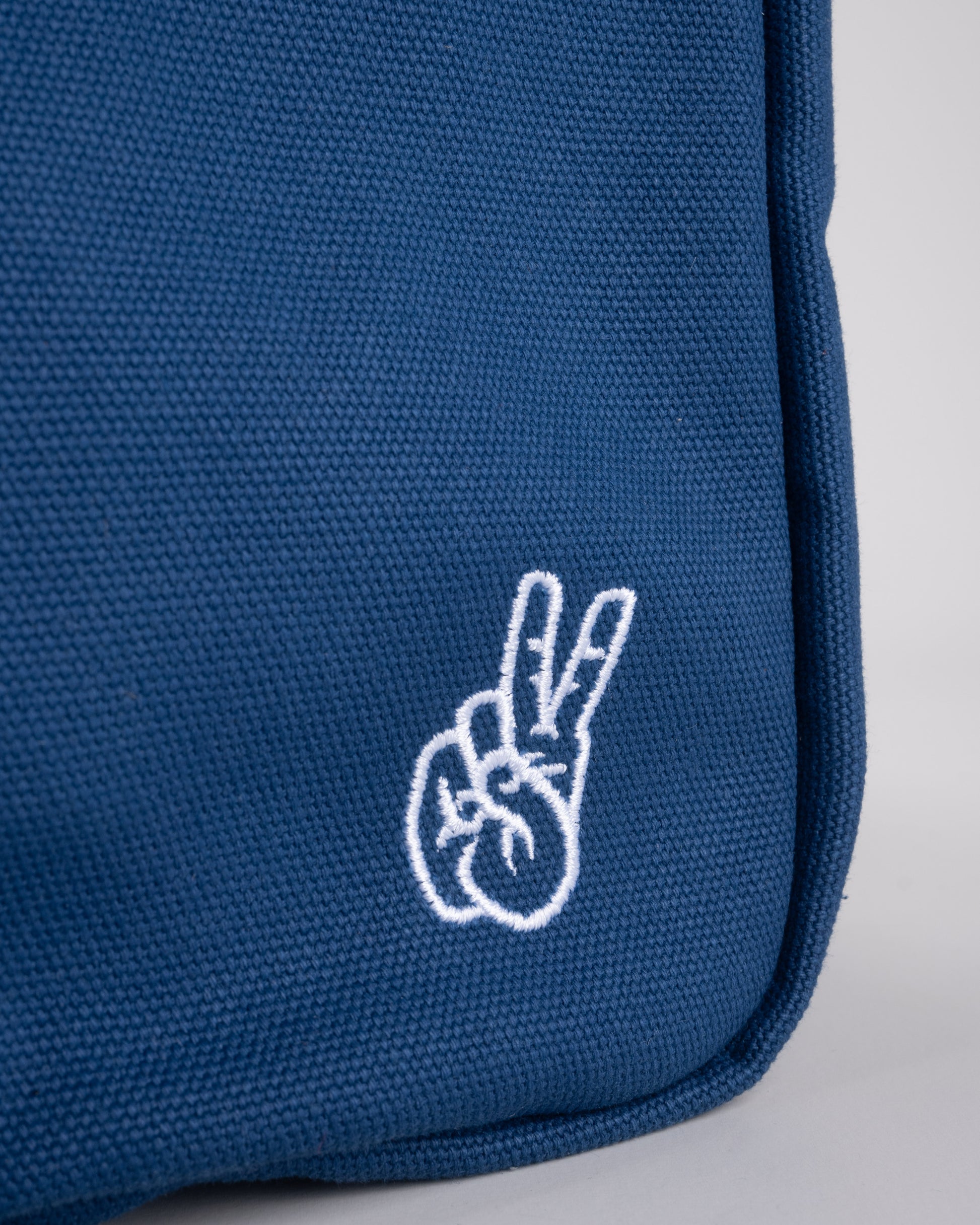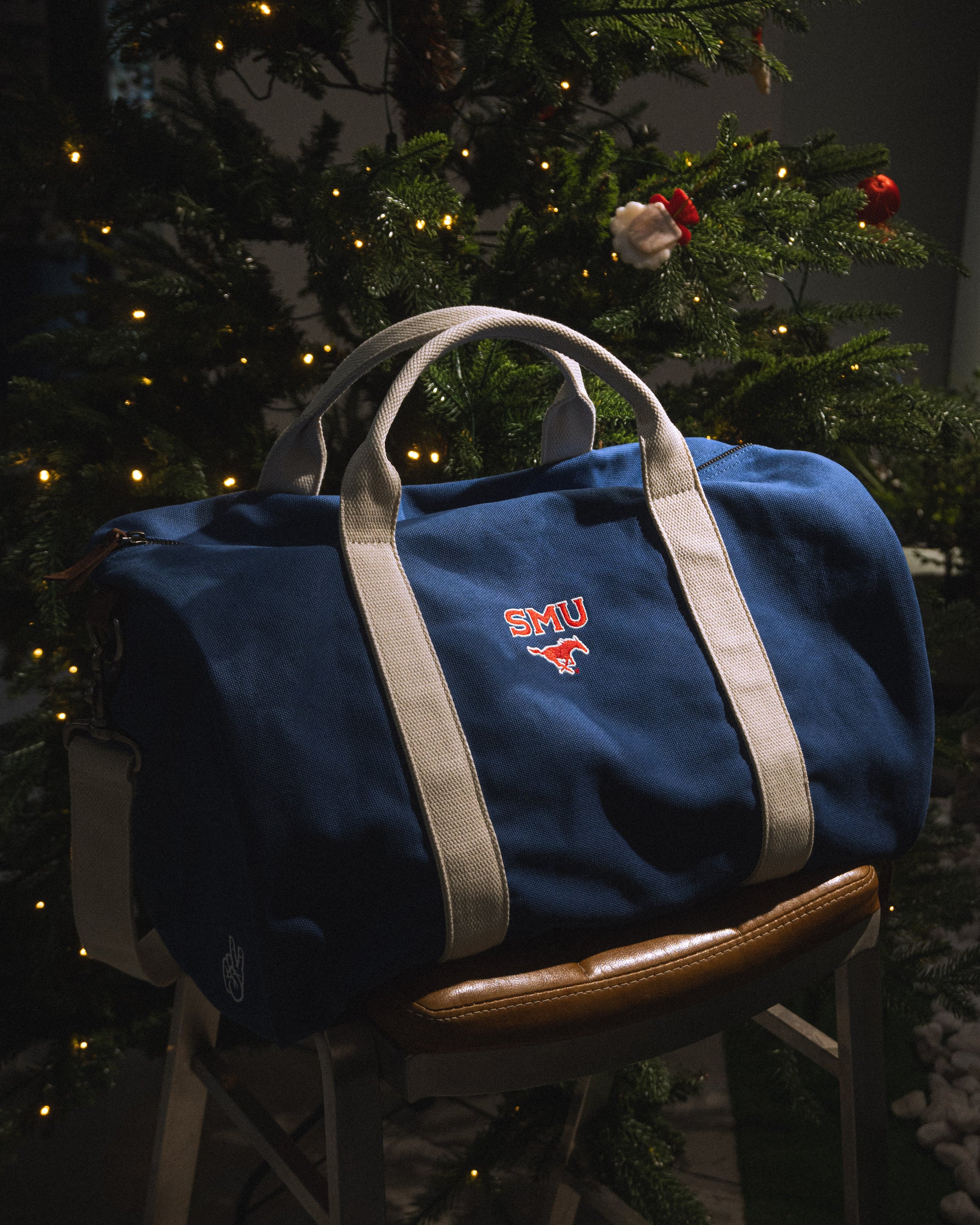 The front features a clean navy canvas panel embroidered with the SMU Mustangs logo, paired with sturdy natural webbing handles for a classic, collegiate look. Along the side, a dedicated zippered shoe compartment provides a separate space for footwear—keeping the main compartment clean and organized whether you’re heading to the gym, the course, or a weekend away.